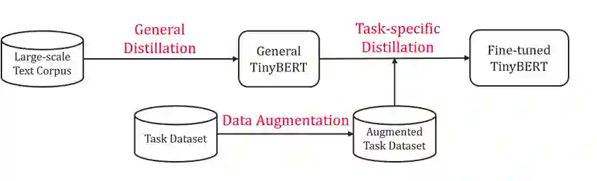 TinyBERT的使用过程分为以下三个步骤:蒸馏、数据增强以及特定任务蒸馏。接下来将会对每个步骤进行详细的介绍: