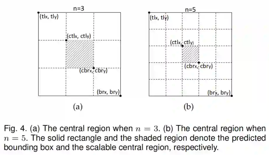其中n为奇数,决定了中心区域 的尺度。本文对小于和大于150的边界框的尺度,n分别设置为3和5。
