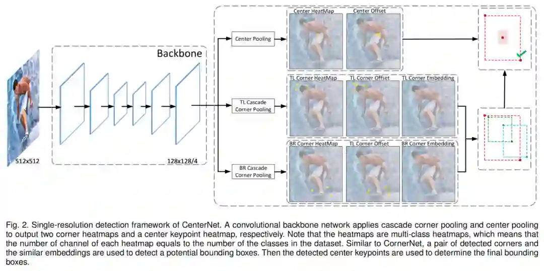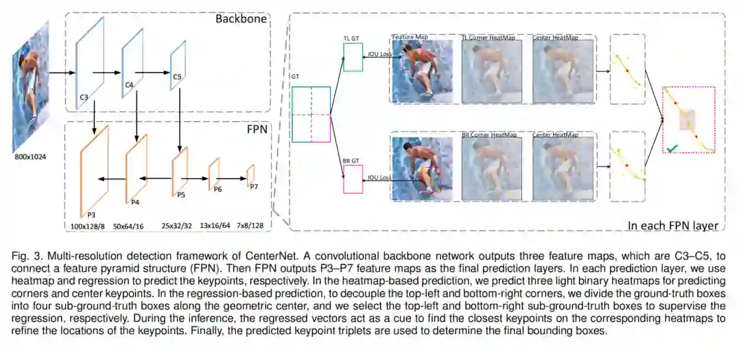 原来的CenterNet仅适用于基于Hourglass的Backbone网络,所有目标仅在一个单分辨率特征图进行检测。作者扩展了CenterNet的思想,使其能够工作在具有金字塔结构的网络中,这使得CenterNet可以在多分辨率特征图中检测目标。为此,作者也提出了新的检测关键点(包括corner keypoints和center keypoints)以及分组keypoints的方法。