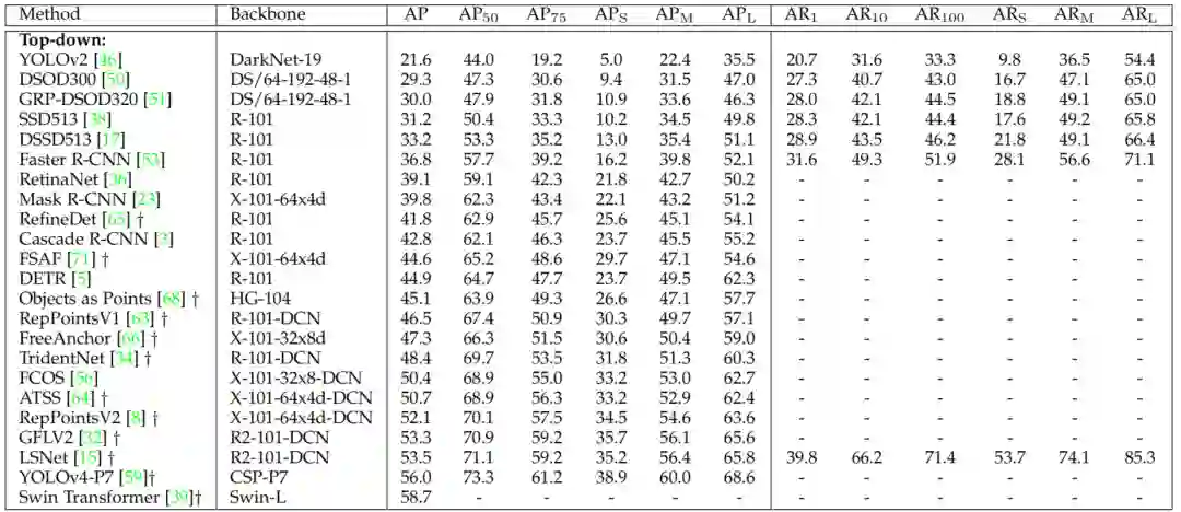 基于以上部分的讨论,作者认为Bottom-up方法在定位任意几何形状的对象方面有更好的潜力,同时召回率更高。这是因为大多数Top-down方法是基于Anchors工作的,这是非常经验的(例如,为了提高效率,只考虑具有常见尺寸和长宽比的Anchors),它们的形状和位置是相对固定的,尽管随后的边界框回归过程可能会略微改变它们的状态。因此,检测器往往会错过形状奇特的物体。