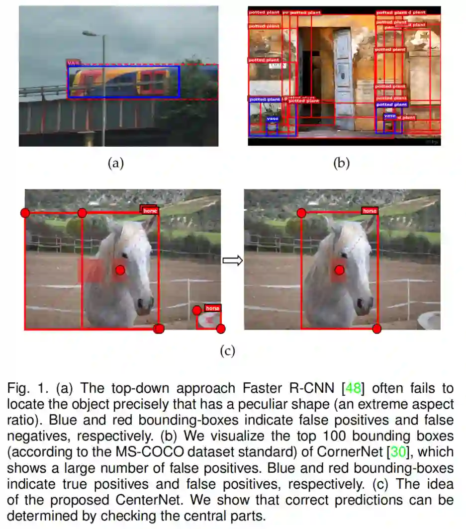 也就是说,由于每个目标都是由一对Corne构造的,该算法敏感地检测目标的边界,而不知道应该将哪些对关键点分组到目标中。因此,如图1(b)所示,CornerNet经常会生成不正确的边框,其中大部分都可以通过一些补充信息过滤掉,例如长宽比。
