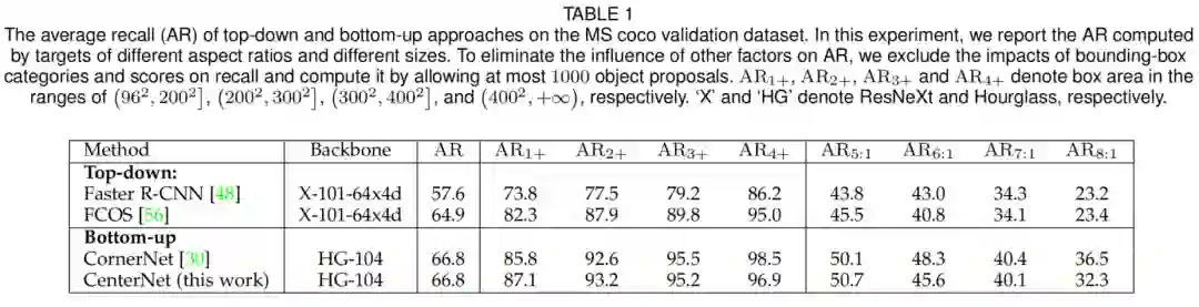 图1(a)是一个典型的例子。作者还提供了一个定量研究,如表1所示。在MS-COCO验证数据集上对三种具有代表性的方法以及本文的工作进行了评估。表1显示,Top-down方法的召回率明显低于Bottom-up方法,特别是对于具有特殊几何形状的对象,例如,规模大于