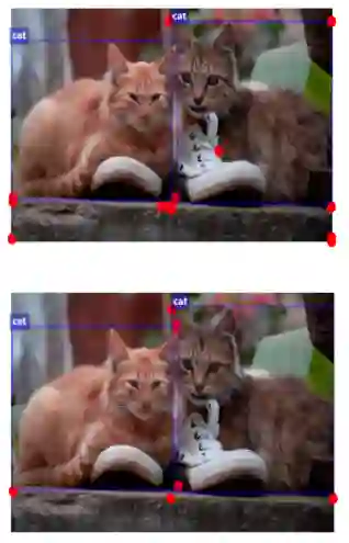 图7(f)显示了采用角池或Cascade corner pooling检测角的结果。可以看到,Cascade corner pooling可以成功定位左侧猫的一对角,而Corner pooling则不能。