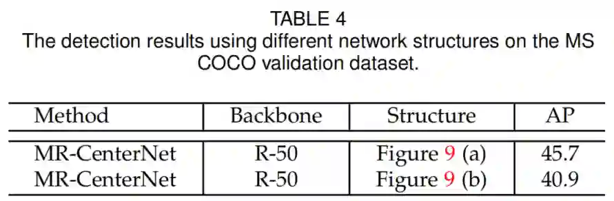 如表3所示,本文提出的MR-CenterNet进一步提高了目标检测精度。例如,在相同的网络深度(Hourglass-52 vs. ResNet-50)下,MR-CenterNet将目标的AP提高了4.8%。由于MR-CenterNet框架的通用性强,能够为CenterNet应用更强的Backbone。
