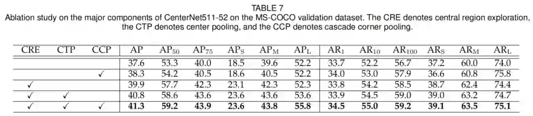 第二行的结果显示,大目标的AP几乎没有变化(即,52.2% vs. 52.2%),但AR提高了1.8%(从74.0%到75.8%)。这表明,Cascade corner pooling有助于在大目标中获得更多的内部视觉模式,但过于丰富的视觉模式可能会干扰其对边界信息的感知,导致许多不准确的边界框。通过使用CenterNet,有效地抑制了不准确的bbox,使大目标的AP提高了2.2%(从53.6%提高到55.8%)。