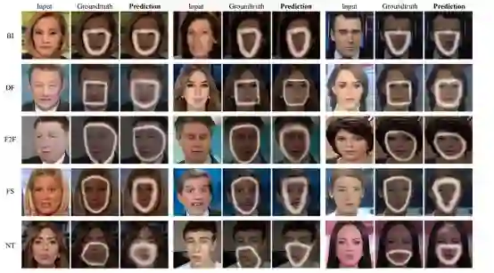 算法预测出的融合边界。BI 表示人工合成人脸。DF、F2F、FS、NT 分别表示 DeepFakes、Face2Face、FaceSwap、NeuralTextures 算法生成的人脸。