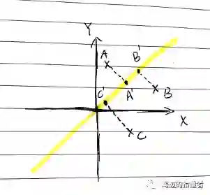 如上图所示,假设我们的原始数据A, B, C是在直角坐标系中的三个点,它们的坐标分别为A(x_a, y_a), B(x_b, y_b), C(x_c, y_c),那么我们现在想要使用pca,将这三个在平面上的点降维到直线上(也就是上图中黄色的线上)。那么现在的问题就是: