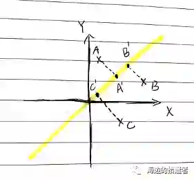 平面中的A, B, C点(高维数据)可以通过怎样的映射关系降维到黄线上(也就是高维的数据如何在低维中表示)。