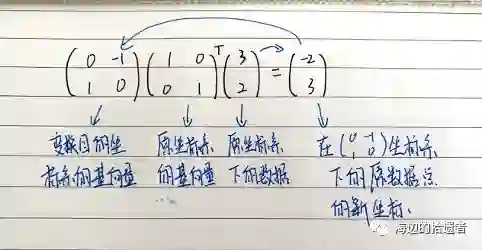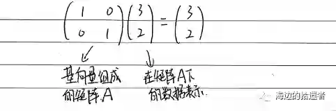 在解决这个问题之前,我们先用矩阵描述一下上一个问题,比如我们现在基向量为(0,1)和(1,0)的坐标中表示(3,2),则可以写作为: