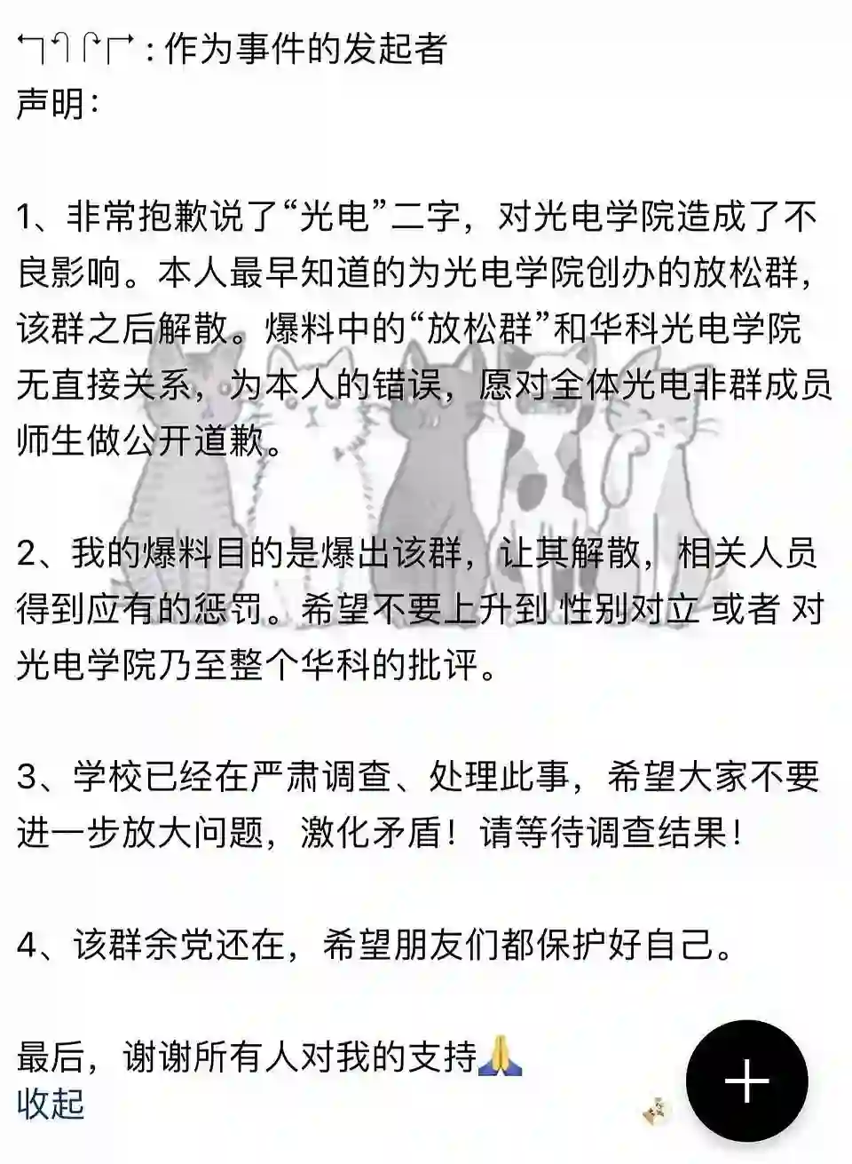 有网友称该群聊来自华中科技大学光学与电子信息学院,但随后爆料者又解释,“本人最早知道的为光电学院创办的放松群,该群之后解散。爆料中的‘放松群’和华科光电学院无直接关系,为本人的错误,愿对全体光电非群成员师生做公开道歉。”