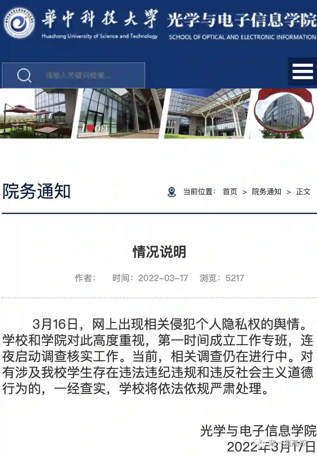 3月17日上午,潇湘晨报记者致电华中科技大学光电学院,工作人员称学院领导也看到了这些信息,非常重视,正在调查中。