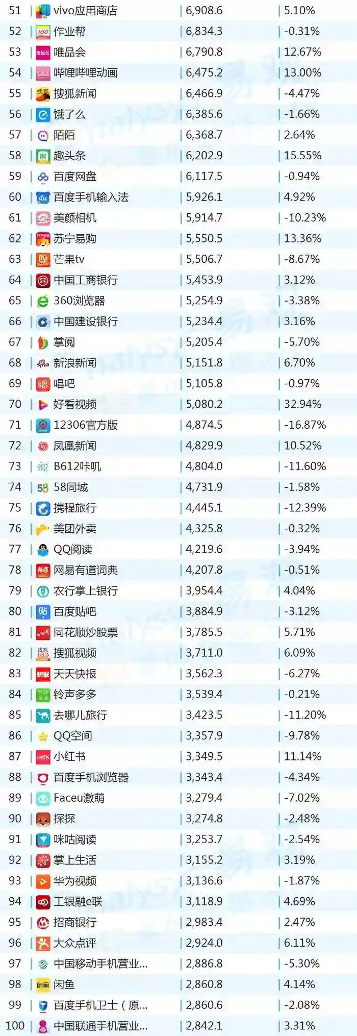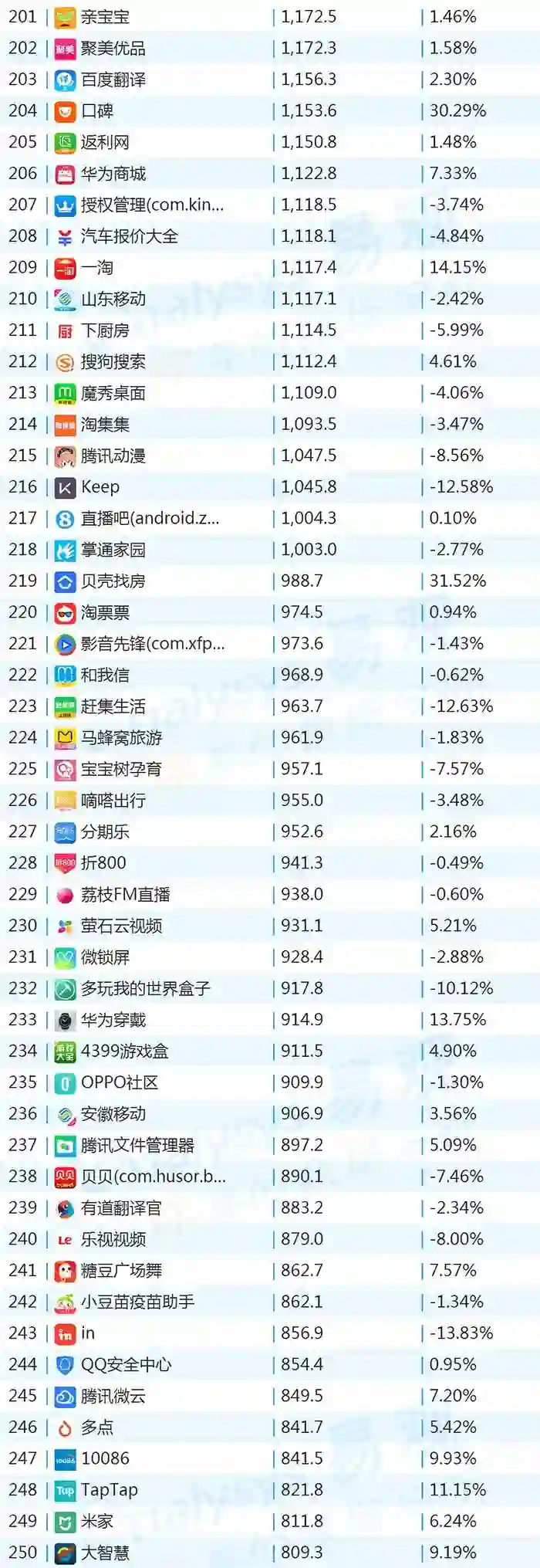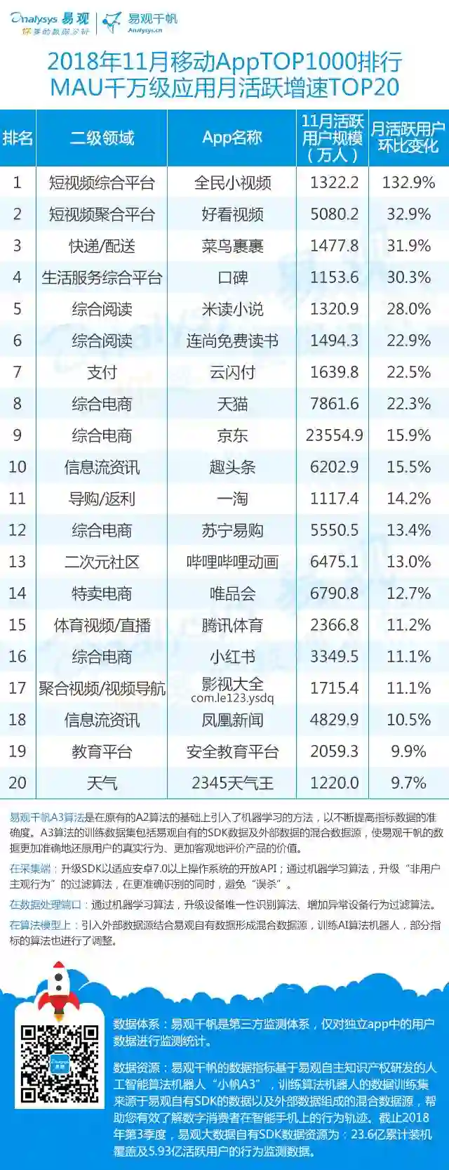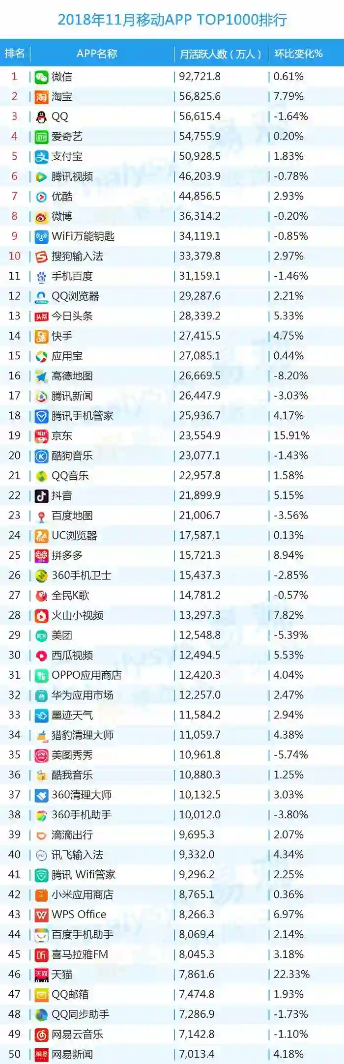 双11的“发起人”阿里,其旗下产品可谓在该月赚足了风头,尤其是淘宝可以说是当之无愧的最大赢家。其在TOP1000榜单排名中,淘宝由10月的第四名一跃成为榜单第二名,月活规模超过了QQ和爱奇艺,表现亮眼。