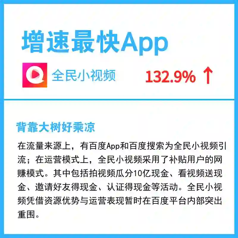 除全民小视频11月表现亮眼外,好看视频也取得了不错的成绩,其采用“收徒赚钱”和“邀请小技巧”的用户裂变推广方式,鼓励用户拉新,提升拉新成功率。11月,好看视频月活跃用户规模达5080.2万,环比增长32.9%,持续保持高速增长趋势。
