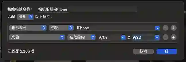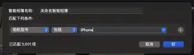 在弹出菜单中选择「智能相册」,并按照下图将匹配条件设置为「相机型号 包含 iPhone」。