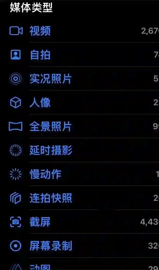 值得一提的是,iOS 的「照片」里其实是有分类的,遗憾的是「媒体类型」中从视频到动图的 11 个分类里,没有一个是「相机相册」。