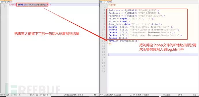 当黑客使用中国菜刀/中国蚁剑访问webshell的时候就会记录下IP地址/访问时间/请求头等信息到log.html文件中