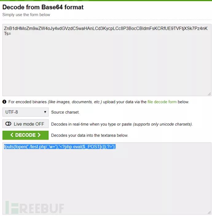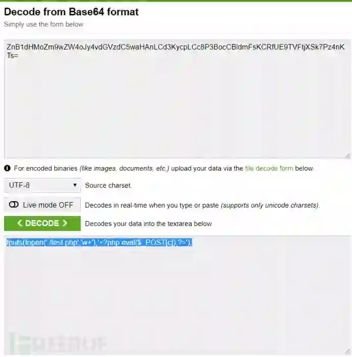 ZnB1dHMoZ**wZW4oJy4vdGVzdC5waHAnLCd3KycpLCc8P3BocCBldmFsKCRfUE9TVFtjXSk7Pz4nKTs=