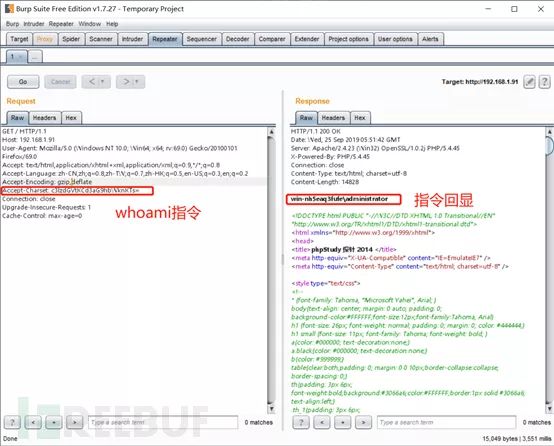 Accept-Charset:”command base64 string”中执行命令经过了的的Base64编码加密: