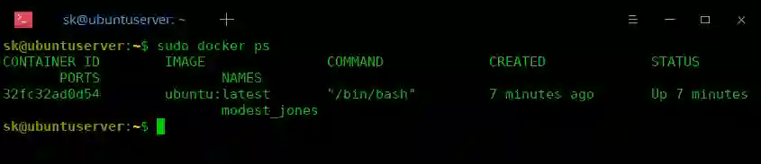 32fc32ad0d54 ubuntu:latest "/bin/bash" 7 minutes ago Up 7 minutes modest_jones