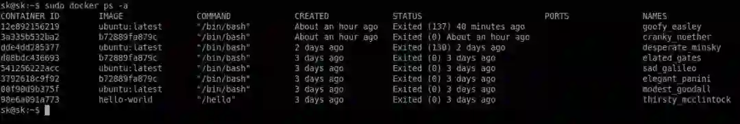 可以通过以下命令查看所有正在运行和停止运行的容器: