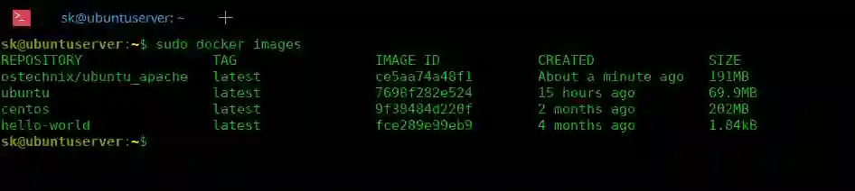 ostechnix/ubuntu_apache latest ce5aa74a48f1 5 minutes ago 191MB