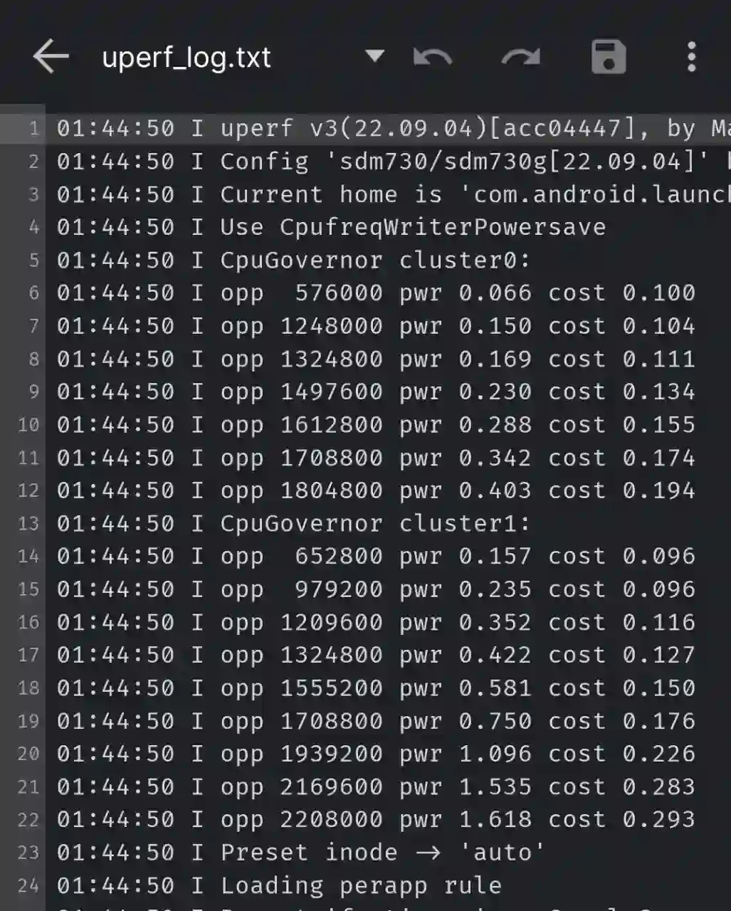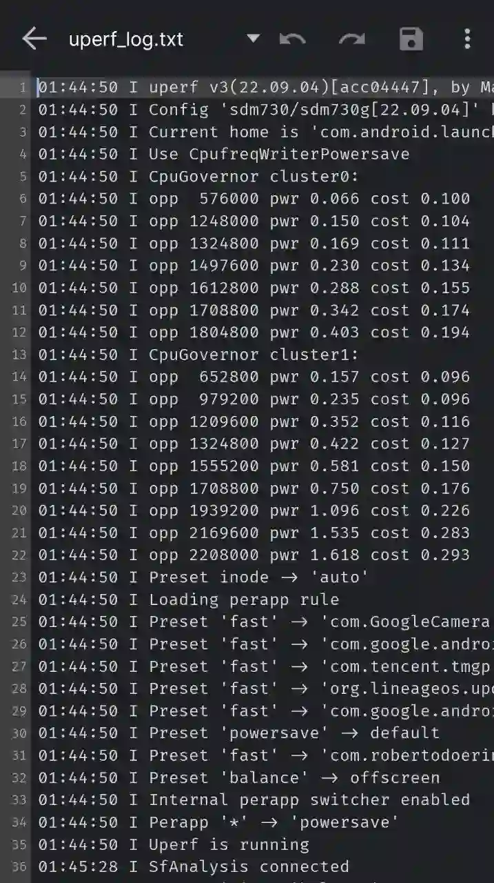 大部分报错都是因为装用的第三方内核修改过调度导致不兼容,或另外安装了类似的性能调度类 Magisk 模块造成冲突。如果我们修改分应用性能配置文件,无需重启手机,Uperf 会实时应用新的设置,这些改动也会反映在 uperf_log.txt 文件中。
