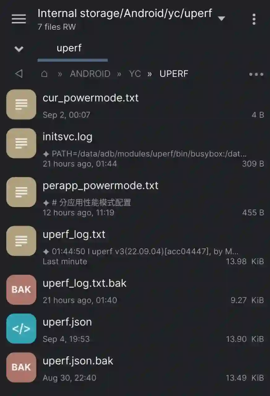 安装模块文件并重启后,Uperf 会在内置存储/Android/yc/uperf 文件夹下创建默认配置文件、日志文件等,我们首先关注 uperf_log.txt 日志文件,检查 Uperf 运行状况。同目录下的 uperf.json 配置文件定义了 Uperf 的行为,一般来说不需要修改,使用 yc 预定义的即可,高级玩家可阅读文档后自行试验。perapp_powermode.txt 分应用性能配置文件我们后面会讲到。所有带有 .bak 后缀的文件并不生效,只作备份用。