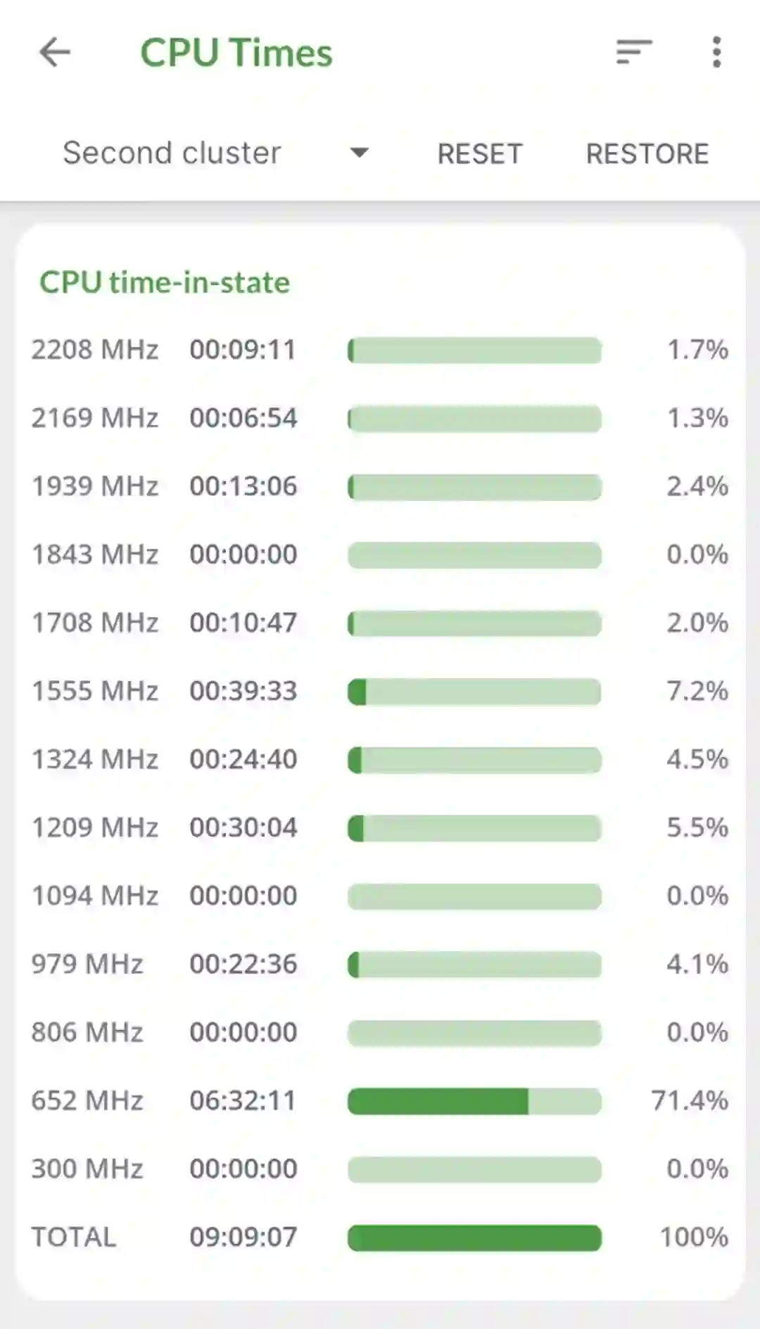 手机厂商们当然也知道这件事:以我手上同样采用骁龙 730G 芯片的两款手机来说,Galaxy M51 开启性能限制后,大核心的最高频也刚好限制在 1555Mhz;Pixel 4a 在 Google 原厂调度下,大核心会尽可能踩中 1555Mhz 这个点。而我们使用 Uperf 也会获得类似的频率点分布: