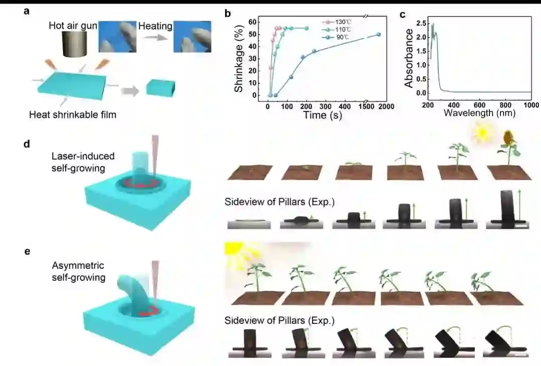 图:(a)-(b) 热缩聚苯乙烯薄膜的收缩特性。(c) 热缩薄膜的UV-Vis光谱吸收特性。(d) 飞秒激光连续对称扫描诱导微直柱生长。(e) 飞秒激光连续非对称扫描诱导直柱弯曲。