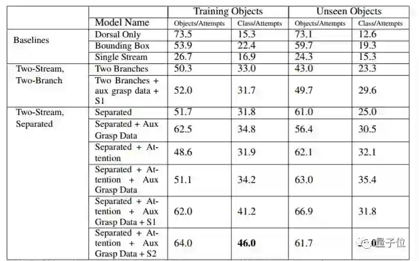 在本次实验中,通过让机器人在不同类别的物体中,抓取随机指定的五个物体来评估机器人的语义抓取能力。每次实验重复10次,抓取的物体包含一组30个训练对象和30个未经测试对象。研究人员通过基线比较证明各种架构在决策语义抓取模型中的作用。