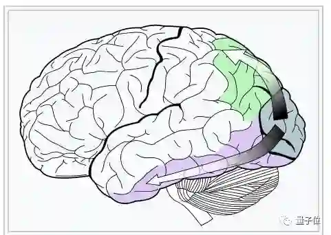 △ 背流(绿色)与腹流(紫色)源于视觉皮层的同一区域/维基百科