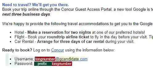 Google在决定聘用某人之前,必须有两三关面试过程,最后一关是,他们会付费让入围应聘者到公司现场面试,我很荣幸,获得了最终现场面试资格。前期电话沟通中,招聘人员简单地向我提到,他们正在使用一种名为Concur的第三方差补费用系统来让应聘者进行机票预订,而我在喜爱的播客节目Freakonomics中,也能经常听到一些Concur的广告。为了应用该系统进行航班预订,需使用Google提供的用户名和密码,同时须申报如护照号码、性别、地址、紧急联系人等个人信息。