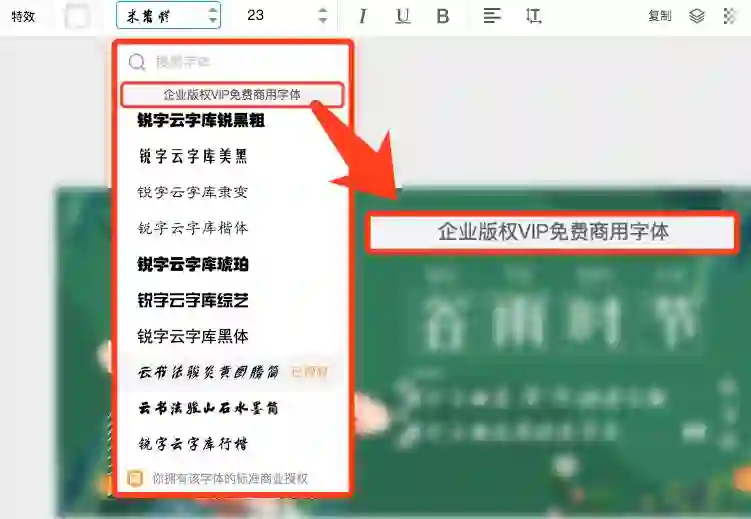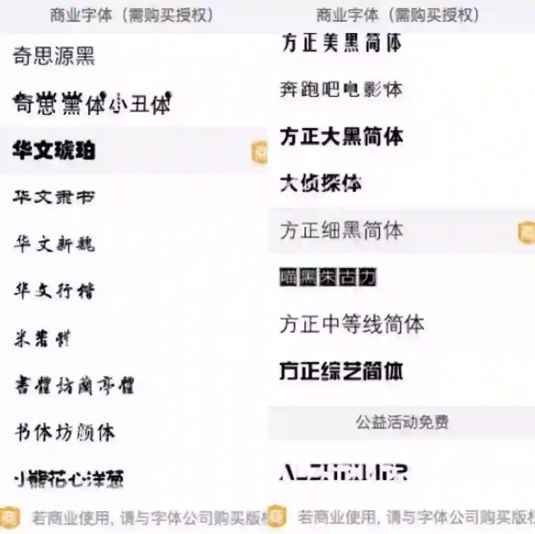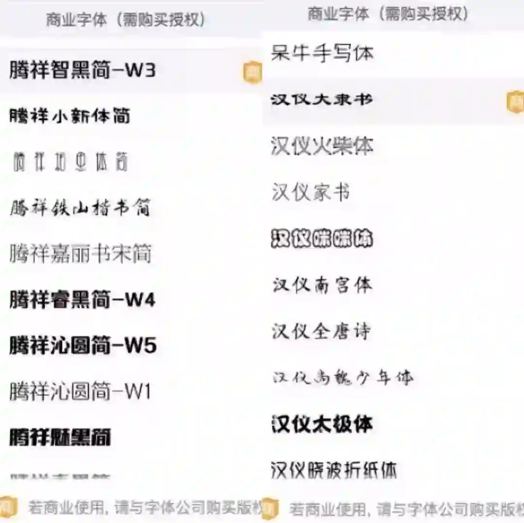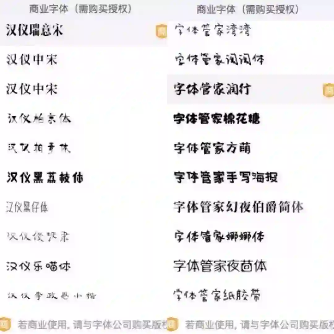 在创客贴的字体选项中,商业使用需要单独与字体公司购买版权的字体,都用以下样式标注