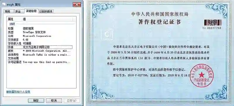 方正公司拥有“方正兰亭黑系列字体”的全部版权。但微软雅黑的版权分为两个部分,在Windows系统的内嵌使用,包括屏幕输出和个人使用为目的的打印,但是以商业发布为目的的微软雅黑版权,仍由方正保留