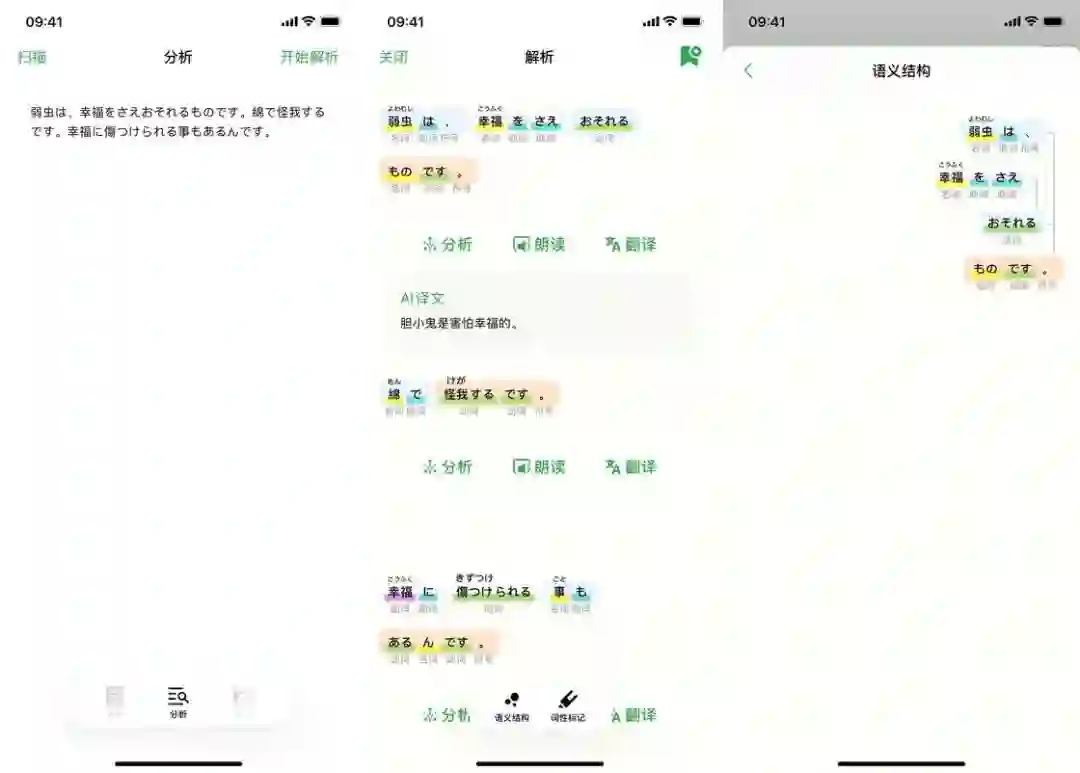 除了互动式的课程外,你依然可以在捧读里找到关于各种词性的详细解释作为参考,帮助你更深入地了解日语的五类动词、敬语等内容。捧读也提供了句子结构分析的功能吗,你可以通过粘贴或扫描的方式导入日语原句,应用会自动为你分析句子成分并提供翻译等选项。