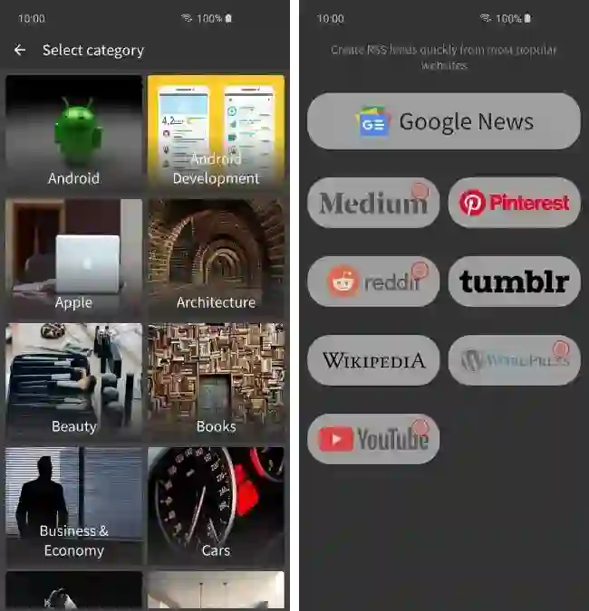 Noah_Choi:Plenary 是一款 Android 平台上的 RSS 阅读工具,采用 Material Design 并默认暗色主题,看起来非常有质感。Plenary 能够离线使用无需担心网络连接。针对 RSS 源订阅问题,Plenary 除了支持常规的链接订阅和内置源推荐外,还有一个名叫「Rss assistant」的功能,其本质是协助用户去「创建」而非「提供」RSS 源,你可以在此订阅 Google News,链接 Tumblr 或 Pinterest 转换为 RSS,或者订阅维基百科上的特定内容。