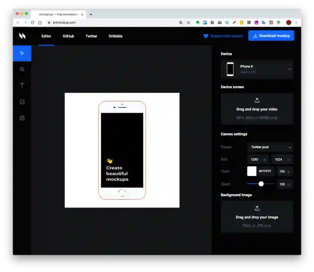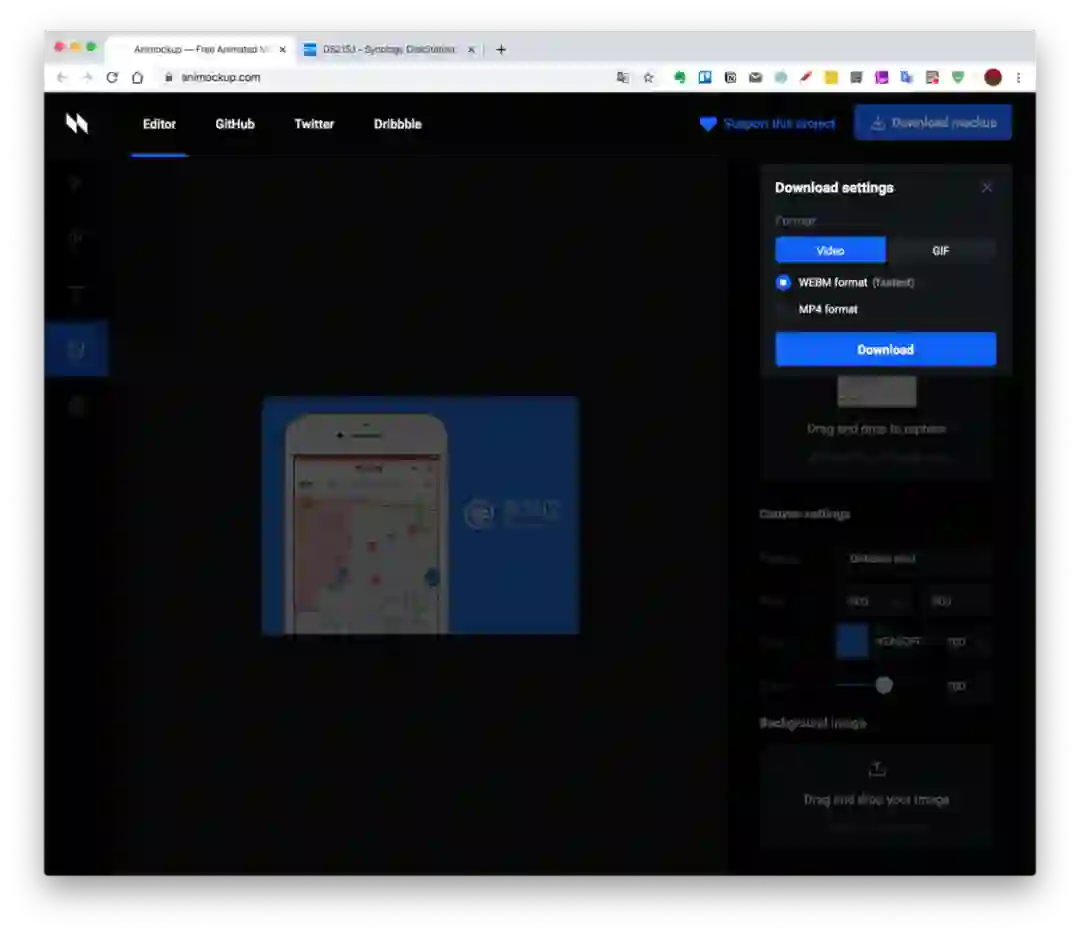 Animockup 提供了两种视频导出的下载方式,一个是自动压缩为 GIF 动图(但清晰度比较差),而另一个就是视频,应用支持导出格式 WebM 或者是 MP4 的文件,用来适应不同场景的展示和宣传需求。