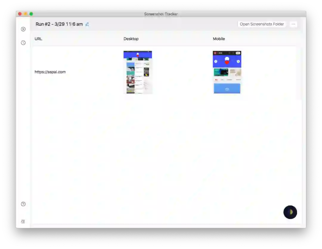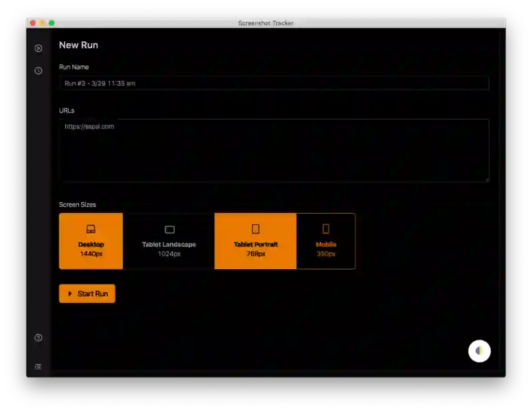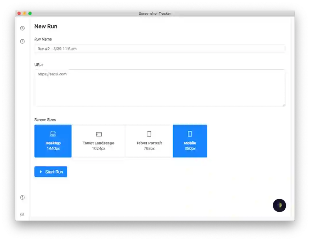 Screenshot Tracker 就是一款可以实现自动化网页截图的工具,通过执行自动化的任务,可以一次性地实现桌面端、平板(横置)、平板(竖置)以及手机端等不同设备下对应网页规格的网页截图操作,实际操作起来也非常简单:点击「New Run」创建任务,之后在任务创建页面中输入需要截图的网页地址(可以输入多个网址),之后屏幕尺寸页面中选择设备类型,直接点击「Start Run」后等待即可。