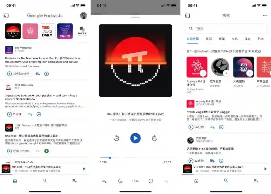 Google 播客免费提供了「剪掉无声部分」的功能,得益于 Google 优秀的算法,裁剪后的音频听起来非常自然。另外,Google 播客还拥有基于 AI 算法的「为您推荐」功能,帮助你发现更多有趣的播客。