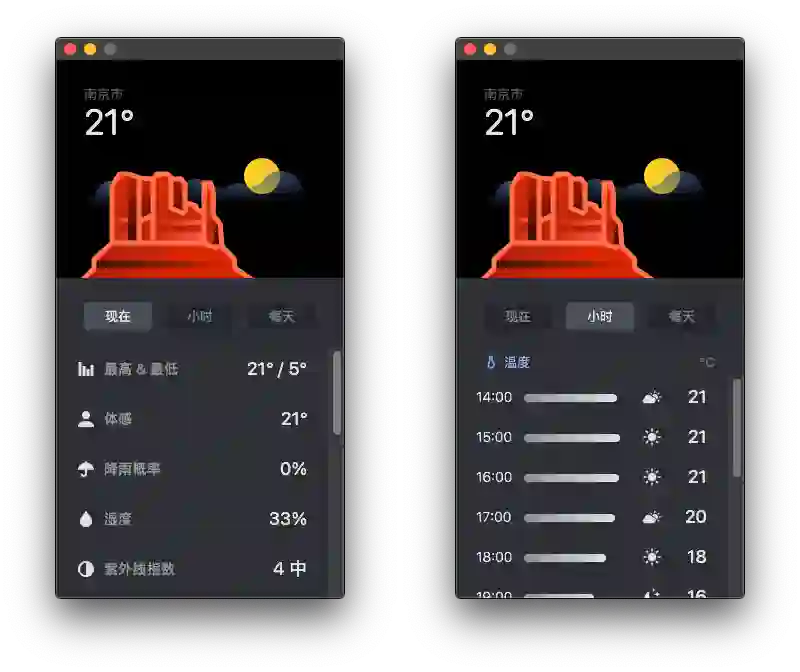 化学心情下2:虽然在 macOS 中我们可以通过通知中心来查看当天的天气,但相比桌面或者是 Dock 栏而言依旧不够直观,显然最为直观明了的方式就是通过 Dock 栏实时显示,这样无需多余操作就可获知当前的天气状况。