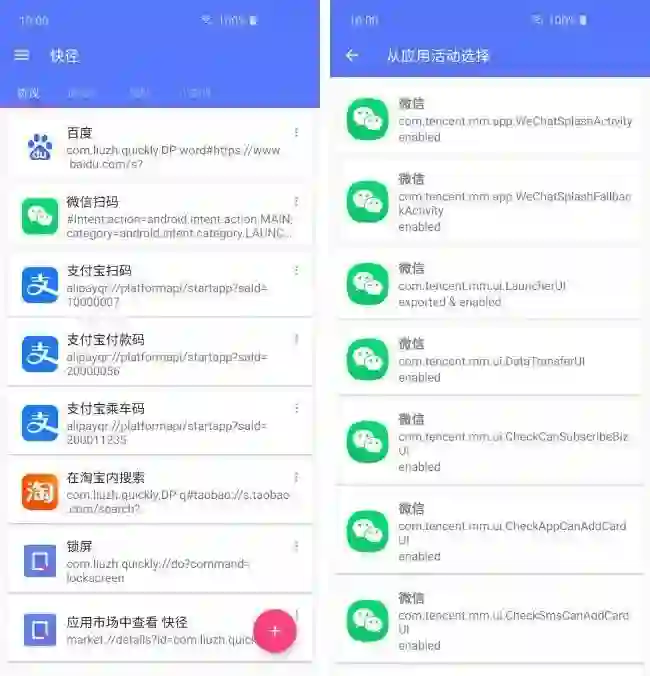 基础功能方面,快径与其他同类 App 相差无几,直接选择外部 Activity 或输入合法协议后,这一个快捷方式就存储在「协议库」中,未来我们所创建的快捷方式都需要从「协议库」中选取而不必再单独添加。前文说到,快径充分利用了 Android 系统特性,因为它可以使用通知栏、快速操作磁贴、桌面小部件和桌面快捷方式四种方法来部署快速操作,几乎遍布所及之处。