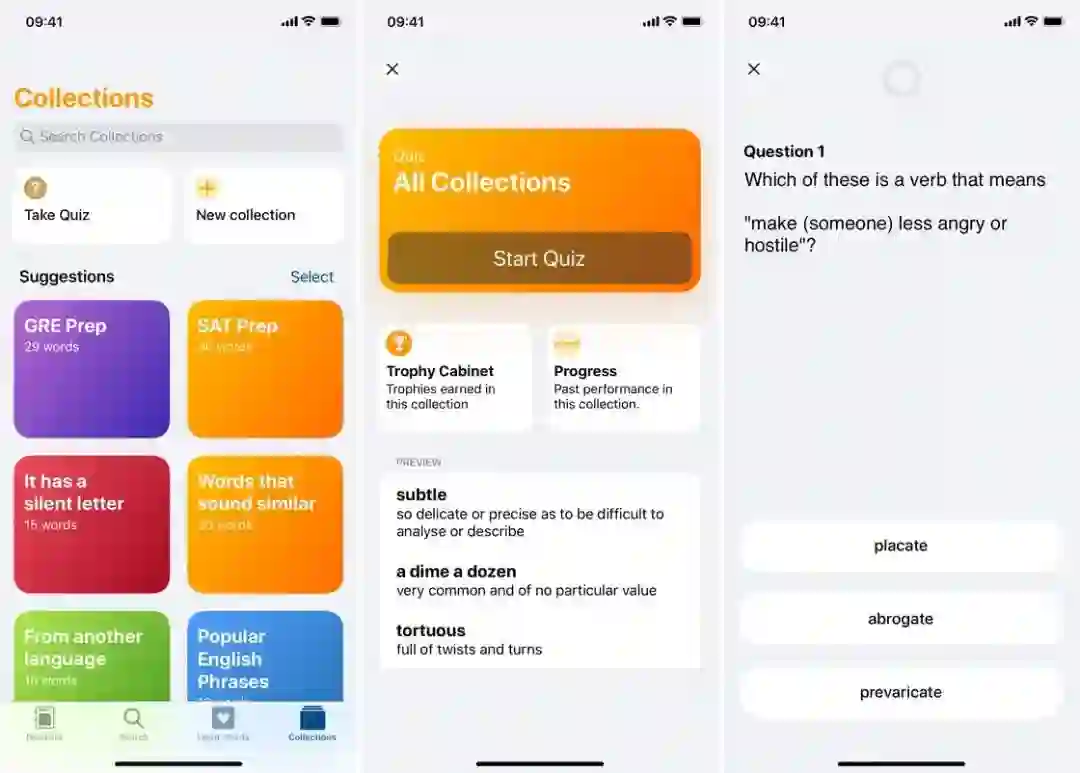 新版本的「测验(Quiz)」功能也印证了这一点。「测验」功能会在你的分类中随机挑选单词,并通过根据词意选词、句子填空等选择题的形式向你提问。在完成测验后,你还可以根据表现获得奖杯。如果你坚持做了多次测验,还可以通过图表来查看自己的进步曲线。