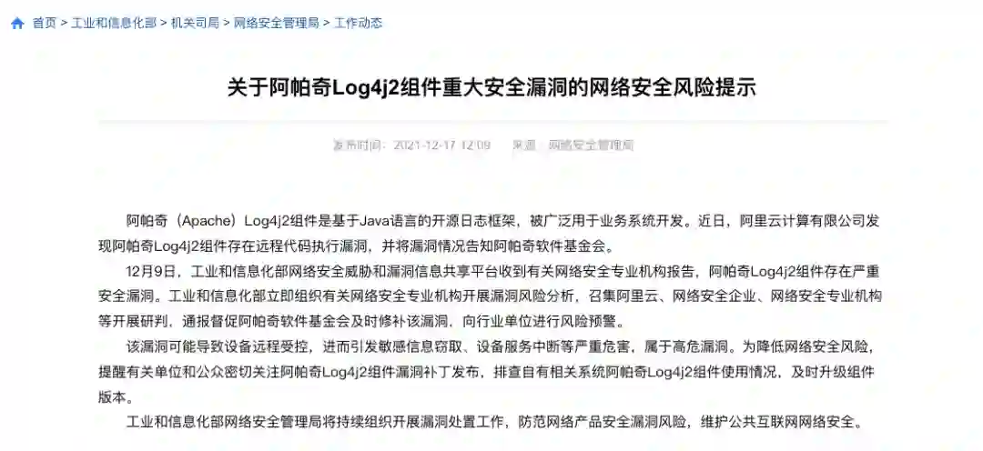 根据工信部官网消息,工业和信息化部网络安全威胁和漏洞信息共享平台 12 月 9 日收到有关网络安全专业机构报告后,立即组织有关网络安全专业机构开展漏洞风险分析。