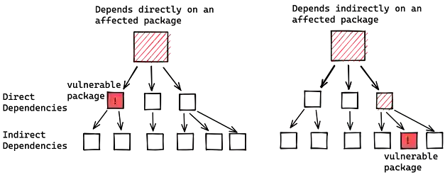 其中,受影响组件中有 7,000 个为直接依赖项,这意味着其任何版本都依赖于受影响的 Log4j-core 或 Log4j-api 版本。而大多数受影响的组件来自间接依赖项(即自己依赖项的依赖项),这意味着 Log4j 没有明确被定义为组件的依赖项,而是作为传递依赖项去影响这些组件。