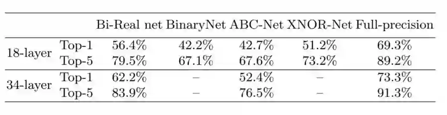 从表中的比较可以看到, 本文提出的 Bi-Real net 比 state-of-the-art Xnor Net 精度由显著提升。