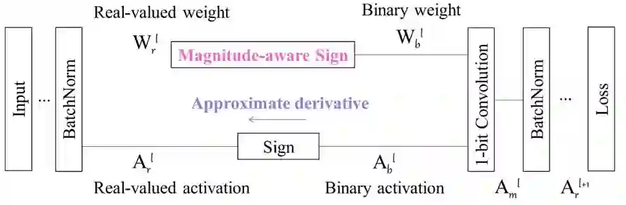 根据用实数值参数的绝对值平均值计算的标量乘以实数值参数的符号作为网络计算导数的二值化参数。这种方法大大缩小了二值化参数与网络内部存储的用于更新的实值参数之间的差距,达到 23% 的网络精度值相对提升。