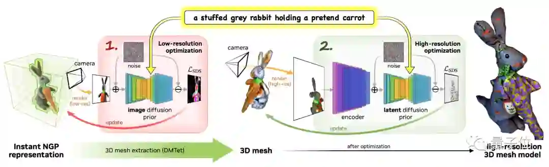 据介绍,Magic3D快速、高质量地得到结果所采用的策略是“从粗到细”,一共经过两阶段:
