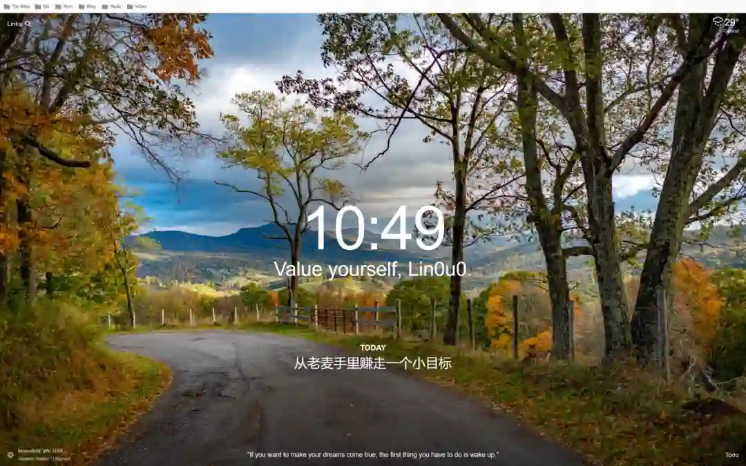 Momentum 会每天更换背景图片和鸡汤,你可以在左上角添加网站快捷方式,在右上角速览当日天气(似乎并不准确),或者自定义是否显示顶部收藏栏等。Momentum 的所有功能都需要在登录后才能使用。