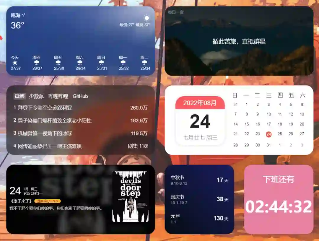 👍🏼 优点:丰富的小组件、多个背景图片源、极简与丰富功能自如切换